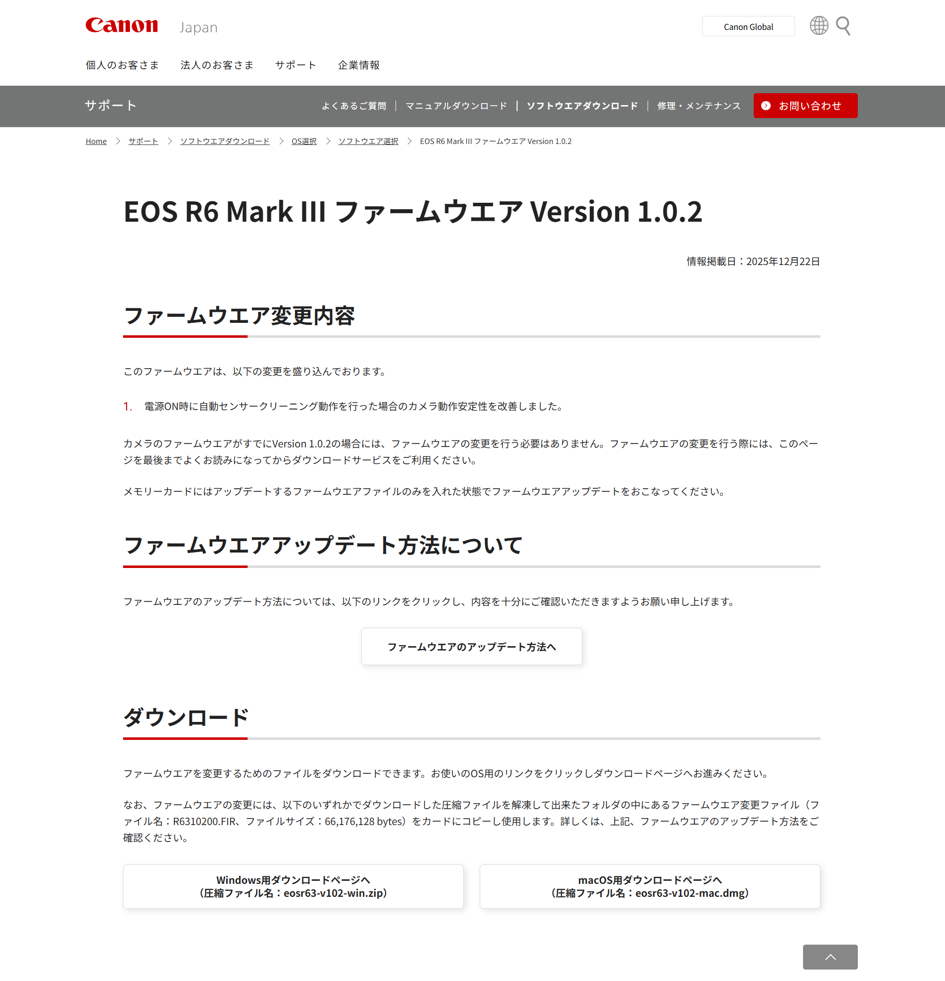 1. Canon公式ページから EOS R6 Mark III 用ファームウェア(Version 1.0.2)をダウンロード