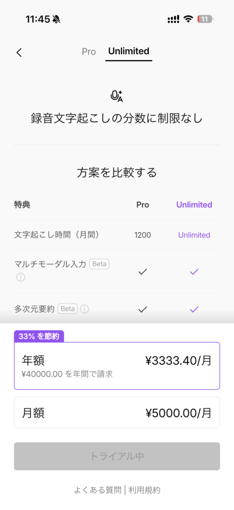 - Proプラン(録音1200分/月)は¥3,000、Unlimitedは¥5,000/月