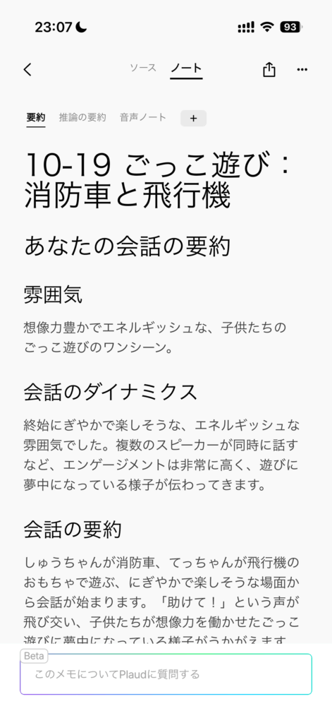 右側の画像では、子供が遊んでいる会話を記録したもので、妻と子供の会話を要約しています。会議などでは、話者も音声から識別してスピーカーとして区別できます。要約のほかのマインドマップやアクションアイテムも整理され、非常に優秀と言えます。